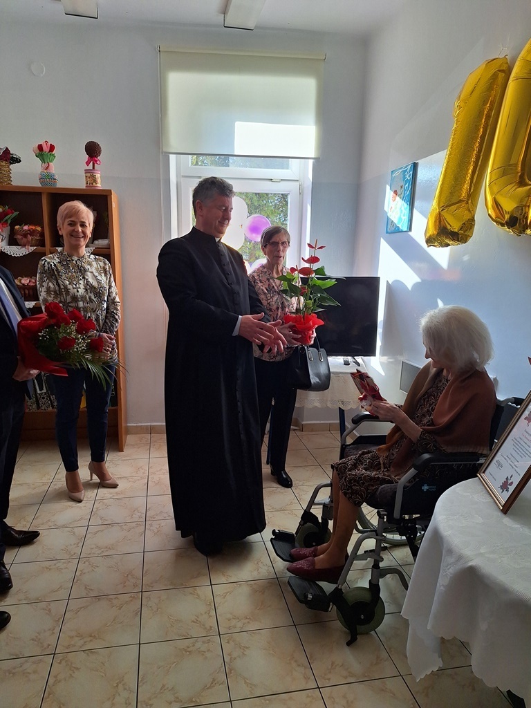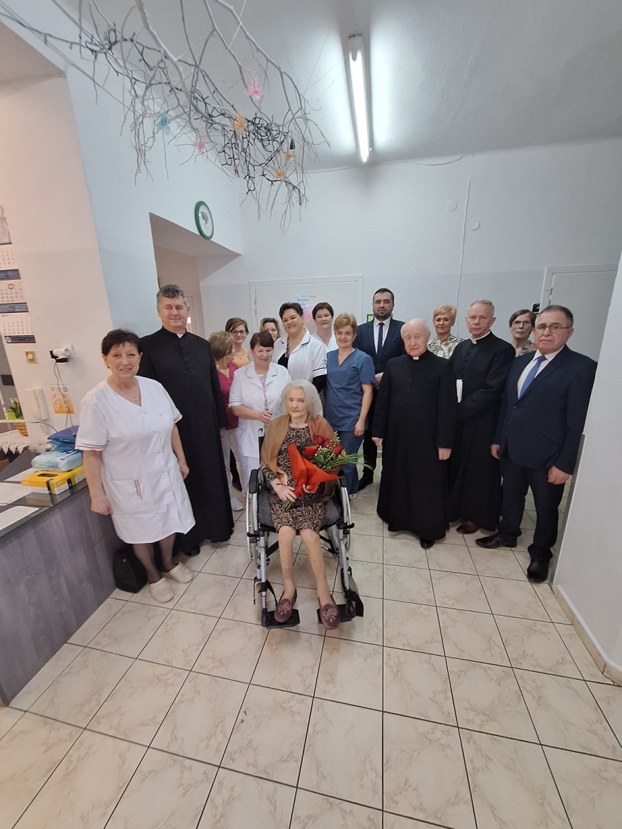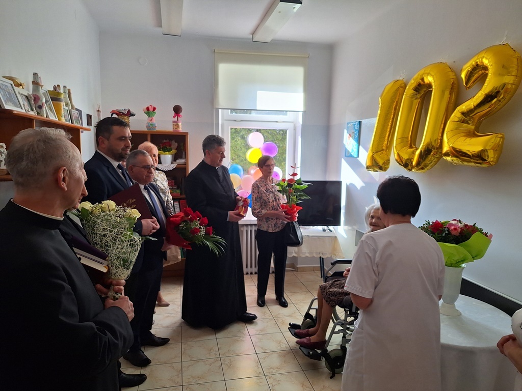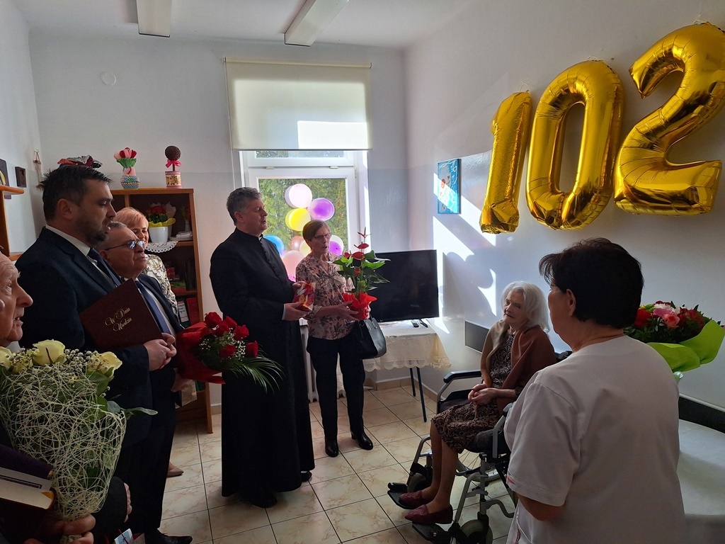 Niezwykły jubileusz przeżywa mieszkanka Różańca Drugiego, która obecnie przebywa w ZOL w Tarnogrodzie – Pani Marianna Kida. Jest najstarszą mieszkanką Gminy Tarnogród i w dniu dzisiejszym obchodzi 102. urodziny. Pamiętali o tym, nie tylko jej najbliżsi. Dostojnej Jubilatce w dniu urodzin towarzyszyli: ks. dziekan Jerzy Tworek, ks. dr Franciszek Kościelski oraz ks. kan. Stanisław Skrok, przedstawiciele samorządu gminnego Paweł Dec – burmistrz Tarnogrodu, Tomasz Legieć – z-ca burmistrza Tarnogrodu, Czesław Larwa – sołtys wsi Różaniec Drugi, Aneta Magoch – z-ca kierownika Urzędu Stanu Cywilnego w Tarnogrodzie, a także Pani dr Grażyna Fido-Księżycka – kierownik i personel Zakładu Opiekuńczo- Leczniczego w Tarnogrodzie.