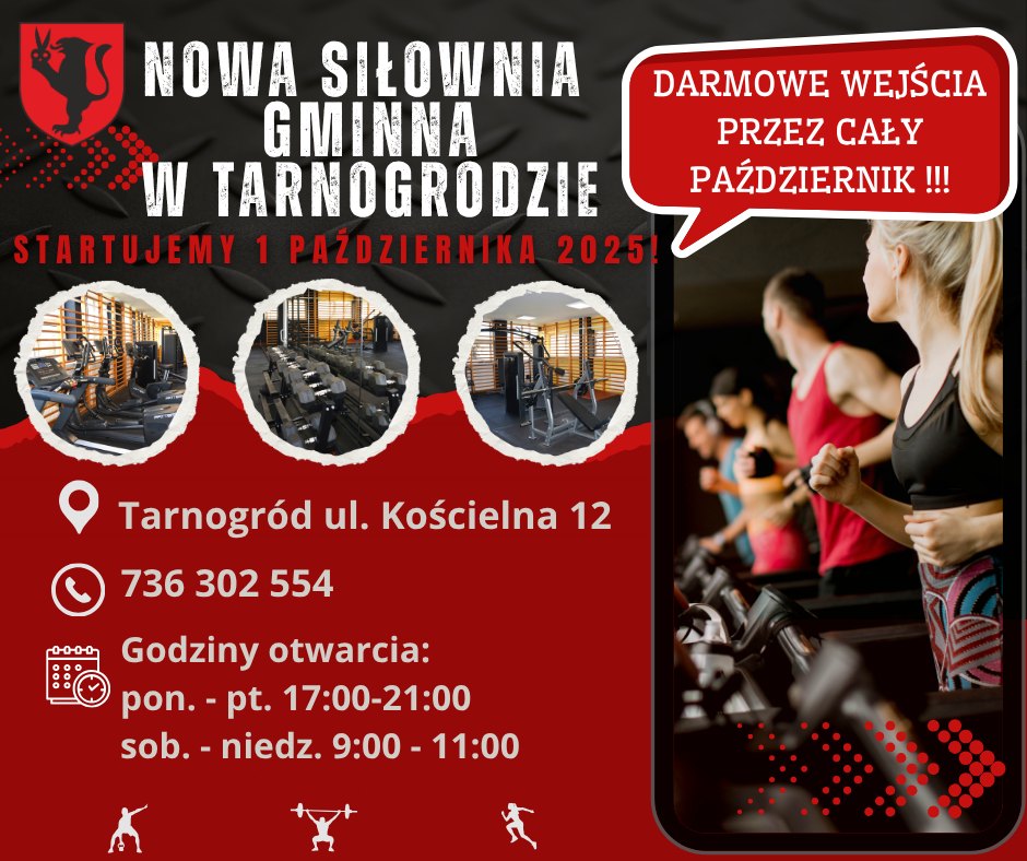 1 października 2025 r. otwieramy nową siłownię gminną przy ul. Kościelnej 12 w Tarnogrodzie.
