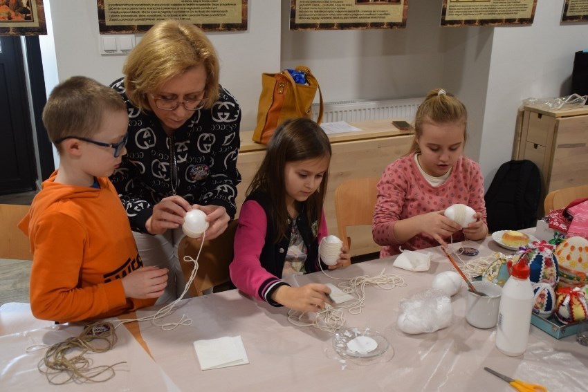 Magdalena Futoma z Tarnogrodu uczyła techniki wyklejania materiałem i sznurkowej. To metoda „najbezpieczniejsza”, ponieważ ozdabia się jajka styropianowe.  Mogą ją z powodzeniem stosować najmłodsi, ponieważ szybko można osiągnąć upragniony efekt, no i jajka nie da się zbić. Dekorowanie sznurkami wymaga od uczestników trochę więcej cierpliwości i precyzji, ale efekt zawsze bardzo cieszy.