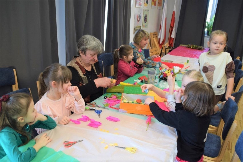 Teresa Fus z  Księżpola uczyła na warsztatach techniki wykonywania kwiatów z bibuły i krepiny. Dzieci, młodzież i dorośli tworzyli według jej wskazówek kolorowe wiosenne kwiatki, którymi będą mogli przyozdobić palmę wielkanocną i świąteczny stół.