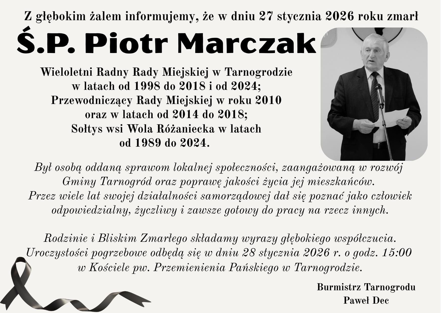 Z głębokim żalem informujemy, że w dniu 27 stycznia 2026 r. zmarł Piot...